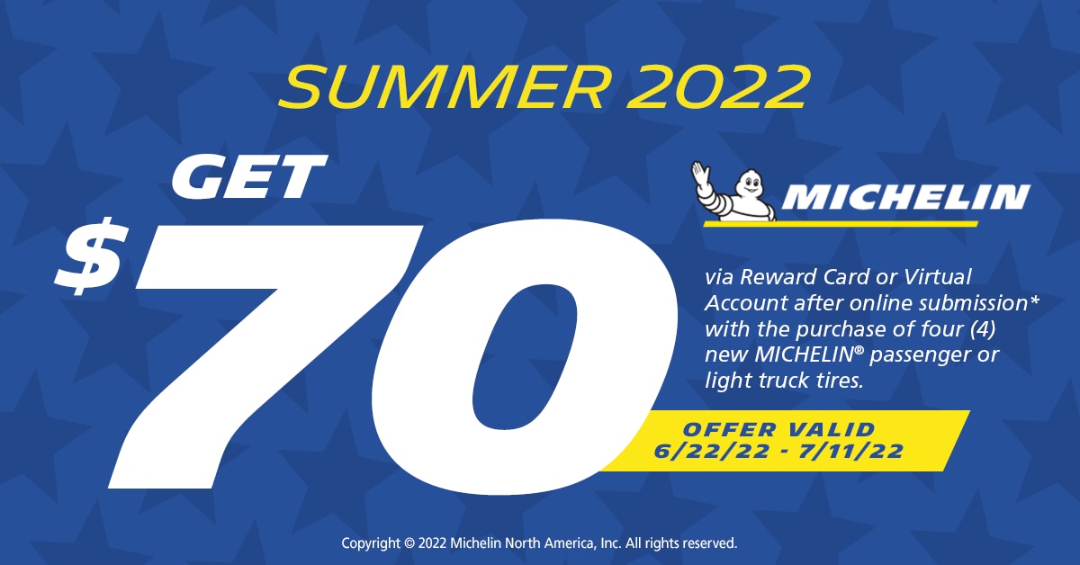 When you purchase a set of four new MICHELIN® passenger or light truck tires you may be eligible to receive a $70* Visa® Reward Card¹ or Visa® Virtual Account² after online submission. Offer valid on tires purchased from Tire Rack's in-stock inventory between 12:00 a.m. EDT June 22, 2022 and 11:59 p.m. EDT July 11, 2022.