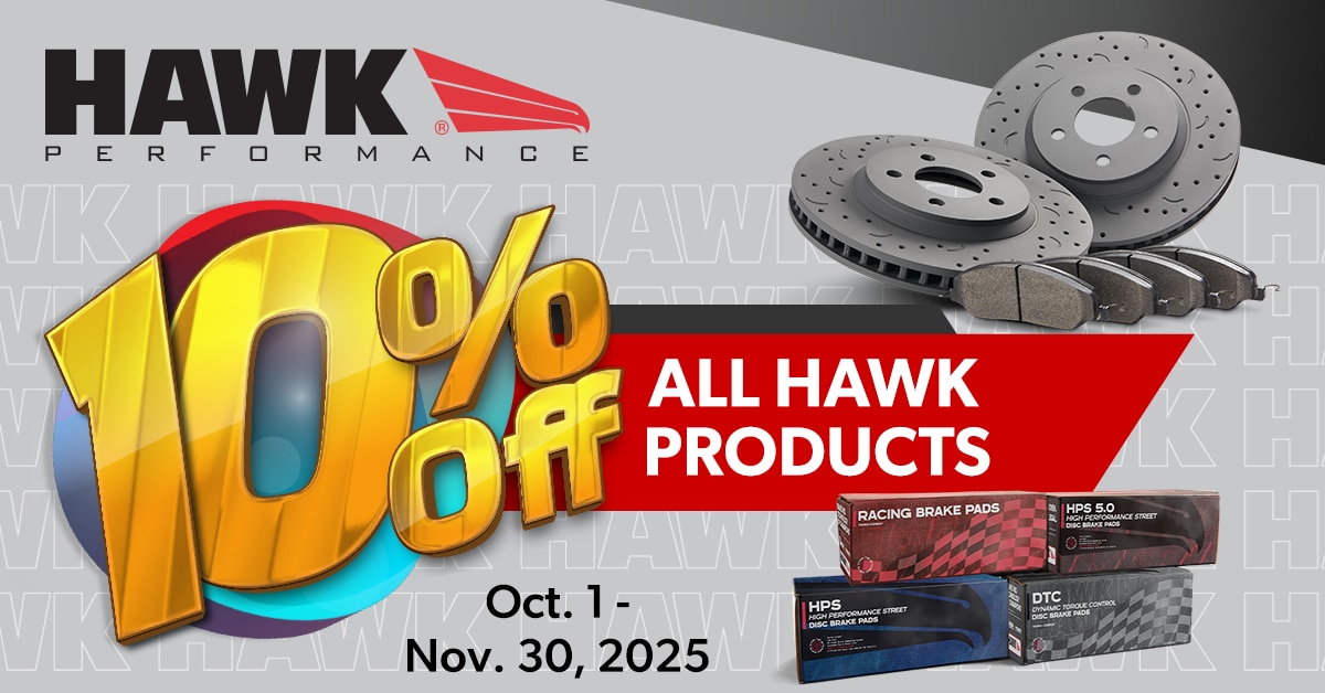 In October and November, save 10% on all Hawk Brake products. Save on your next brake job and get brake products that are engineered to meet and exceed the demands of high performance street applications.