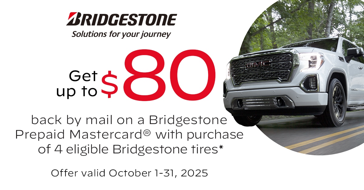 When you purchase a set of four Bridgestone Alenza tires you may be eligible to receive $80 back by mail on a Bridgestone Prepaid Mastercard®. Receive a $70 Bridgestone Prepaid Mastercard when you purchase a set of four Bridgestone DriveGuard, Dueler, Ecopia, Potenza, Turanza or WeatherPeak tires. Offer valid on qualifying tires purchased from Tire Rack’s in-stock inventory between 12:00 a.m. EDT October 1, 2025 and 11:59 p.m. EDT October 31, 2025.