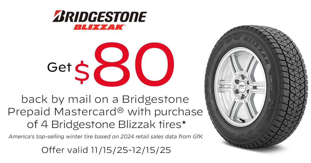 When you purchase a set of four Bridgestone Blizzak tires you may be eligible to receive $80 back by mail on a Bridgestone Prepaid Mastercard®. Offer valid on qualifying tires purchased from Tire Rack’s in-stock inventory between 12:00 a.m. EST November 15, 2025 and 11:59 p.m. EST December 15, 2025.