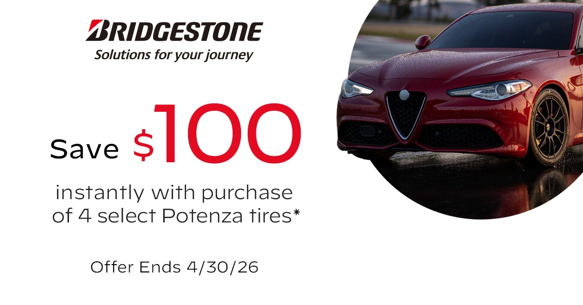 Get $100 Instant Savings when you purchase a set of four select Bridgestone Potenza tires from Tire Rack's in-stock inventory.