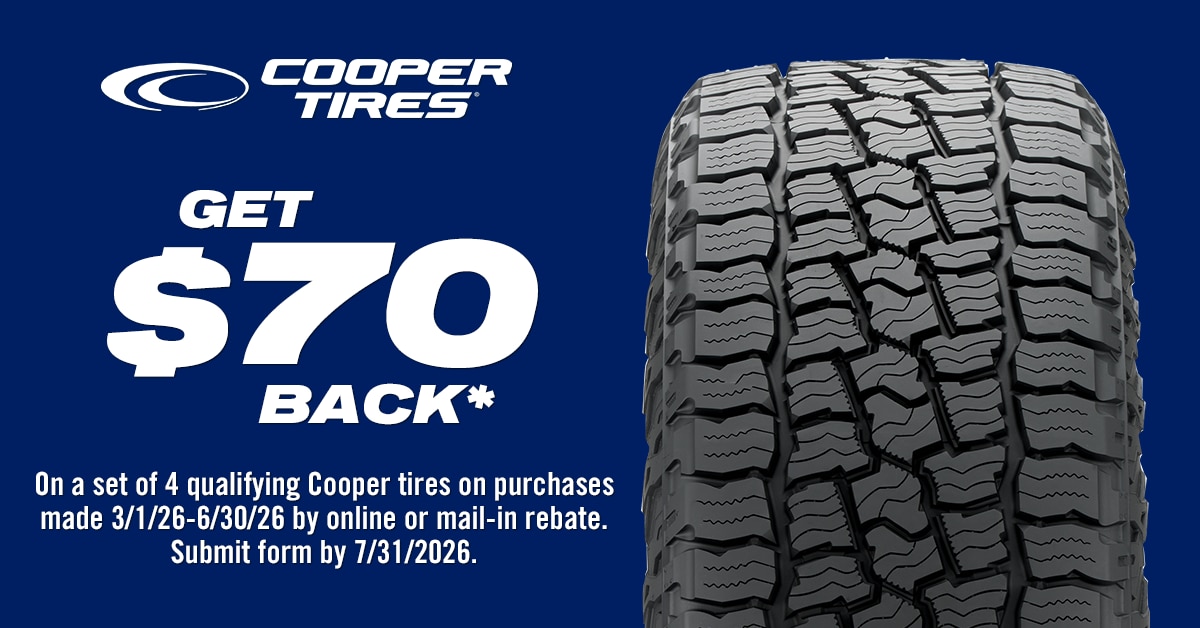 This offer is contingent on the purchase of a new set of four qualifying Cooper tires (in a single transaction) from March 1 – June 30, 2026. Rebate requests must be postmarked or submitted online no later than July 31, 2026, and received no later than July 31, 2026. Late submissions will not be accepted. Amount of the rebate depends on the qualifying tires purchased and the availability of qualifying new tires at the time of purchase. A $70 rebate available for the purchase of the following qualifying tires purchased as a set of four: Cooper Discoverer Stronghold® AT, Discoverer Road +Trail® AT, ProControl®. Substitutions are not eligible, and all requirements set forth herein must be met to be eligible. Limit of one rebate per new set of four qualifying Cooper tires purchased in a single transaction. Purchases must be for household use, and offer is limited to two claims per person, family, household, email or address during the offer period. Requests from groups, organizations or businesses will not be accepted. Offer is not available to the affiliated dealers of Sponsor, their respective owners and employees, or immediate family members of such owners or employees. Offer not valid for business or fleet vehicles. Purchaser is responsible for all applicable taxes and other fees. This offer may not be combined with any other offers from Sponsor. Apply for your rebate online or via mail. This offer is not transferable, so the name on the application form must match the name on the sales receipt. Work orders and online order confirmations will not be accepted unless accompanied by a final invoice, receipt or delivery confirmation. All sales receipts, regardless of your submission method, must show the qualifying Cooper tires, purchase price, tire size, retailer information and your name. Circle the tires and size purchased, which must be one set of four of the qualifying Cooper tires. Online: Go to https://www.coopertirespromos.com. Follow the directions to enter in your name and address and upload your receipt. This is the name that will appear on your Cooper Tires Mastercard Prepaid Card or your Cooper Tires Prepaid Mastercard Virtual Account. Mail: Complete the mail-in form. Please print clearly in large capital letters. This is the name that will appear on your Mastercard Prepaid Card. A Cooper Tires Prepaid Mastercard Virtual Account is not available for mail-in applications. Include the original dated sales receipt. Please do not use staples when sending your information. Please mail to: Cooper Tires Rebates, PO Box 787, Portsmouth, NH 03801. No rebate will be issued for requests that are not properly submitted. Keep copies of all documents for your records, as well as a record of the date your rebate request was submitted. All submitted documents will become the property of Sponsor and will not be returned. Please allow six to eight weeks after Sponsor receives the request for the delivery of your Mastercard Prepaid Card or Virtual Account. If Card/Virtual Account is not received within 8 weeks, contact a Sponsor representative by calling (833) 237-5109. You must notify Sponsor of any claim of non-delivery of your Mastercard Prepaid Card or Virtual Account no later than September 30, 2026. Claims of “lost materials” will not be honored unless accompanied by proof of receipt of materials by Sponsor. If you claim a rebate was not delivered or was improperly denied, you will be required to furnish Sponsor with a copy of all materials you submitted for verification. Incomplete requests will delay processing. If any request is submitted but is incomplete, Sponsor’s representative will attempt to notify the sender by mail or email, and you must resubmit the request with all missing information within 10 days of receipt of such notice, together with a copy of the notice. All decisions made by Sponsor (or its authorized representatives) relating to the validity of any submissions are final and binding. U.S. mail fraud statutes prohibit acts devised to defraud or obtain money or property by means of false or fraudulent pretenses if the postal system is involved. This would include, among other things, the use of fictious or assumed names or addresses in order to receive multiple offers. Tampering with, altering or falsifying purchase information constitutes fraud. Sponsor assumes no responsibility for any error, omission, interruption, deletion, defect, delay in operation or transmission, communications line failure, theft or destruction, or unauthorized access to, or any technical failure of any kind, including but not limited to malfunctions, interruptions, or disconnections in phone lines or network hardware or software. Sponsor is not responsible for the security or privacy of information transmitted via computer networks or for breaches of privacy due to interference by third-party computer “hackers” or otherwise. Sponsor reserves the right to disqualify any individual who fails to comply with these terms and conditions or who disrupts or otherwise attempts to affect the administration, security, fairness, integrity or proper conduct of this offer. Sponsor reserves the right to confirm the identity of any rebate recipient, including collecting information about the recipient from third parties. Sponsor is not responsible for delayed, postage due, illegible, damaged, mutilated, late, lost, incomplete, stolen or misdirected requests or for typographical or printing errors or other technical problems associated with, or in any materials for, this offer. Sponsor reserves the right, in its sole discretion, to withdraw or amend this offer in any way, or to amend these terms and conditions without prior notice or obligation, in the event of: (i) any error, technical problem, fraud or any other cause beyond the reasonable control of Sponsor that interferes with the proper conduct of this offer as contemplated by these terms and conditions; and/or (ii) any accident, printing, adm