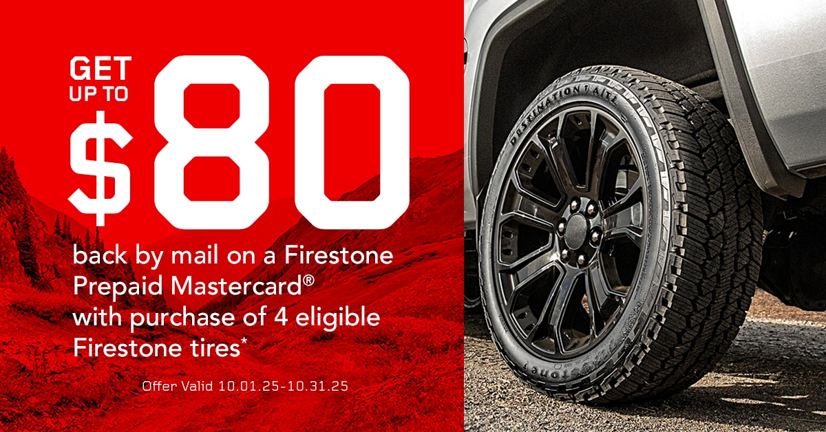 When you purchase a set of four select Firestone tires you may be eligible to receive up to an $80 Firestone Prepaid Mastercard® by mail. Offer valid on tires purchased from Tire Rack's in-stock inventory between 12:00 a.m. EDT October 1, 2025 and 11:59 p.m. EDT October 31, 2025.