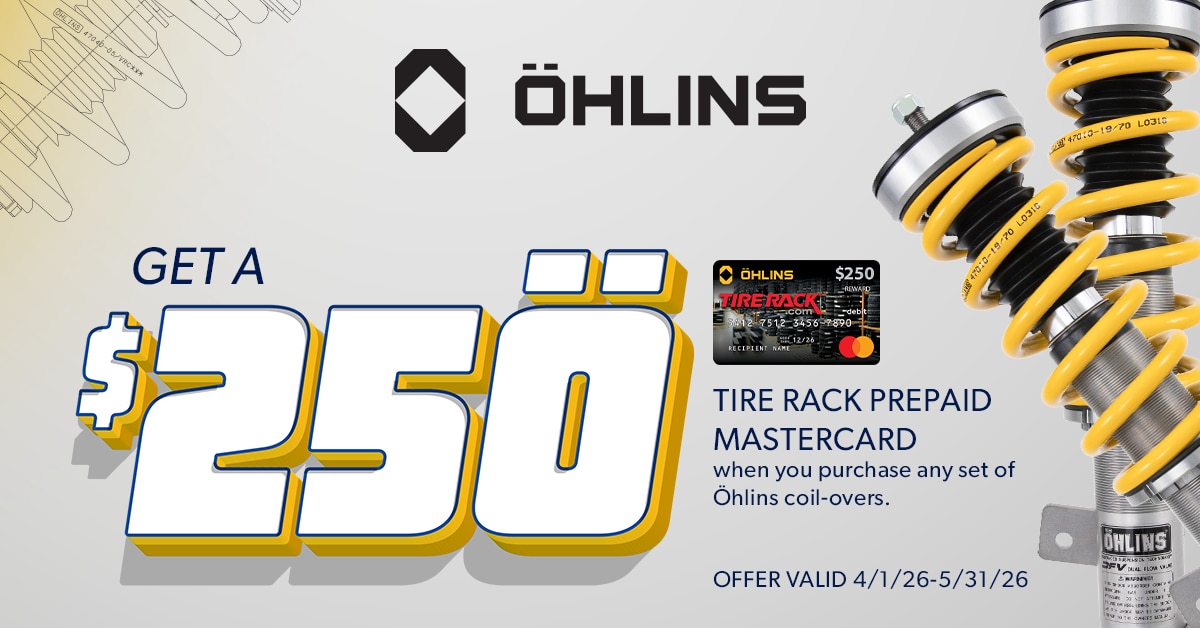 Buy any set of Ohlins coil-overs and you may be eligible to receive a $250 Ohlins Tire Rack Prepaid Mastercard by mail. Offer valid on eligible products purchased from Tire Rack’s in-stock inventory between 12:00 a.m. EDT April 1, 2026 and 11:59 p.m. EDT May 31, 2026.