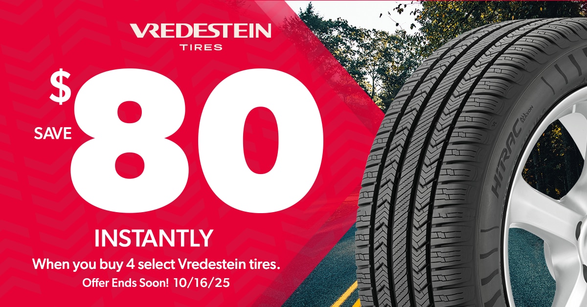 Save $80 instantly when you purchase a set of four select Vredestein tires. Offer valid on qualifying Vredestein tires purchased from Tire Rack's in-stock inventory between 12:00 a.m. EDT October 7, 2025 and 11:59 p.m. EDT October 16, 2025.