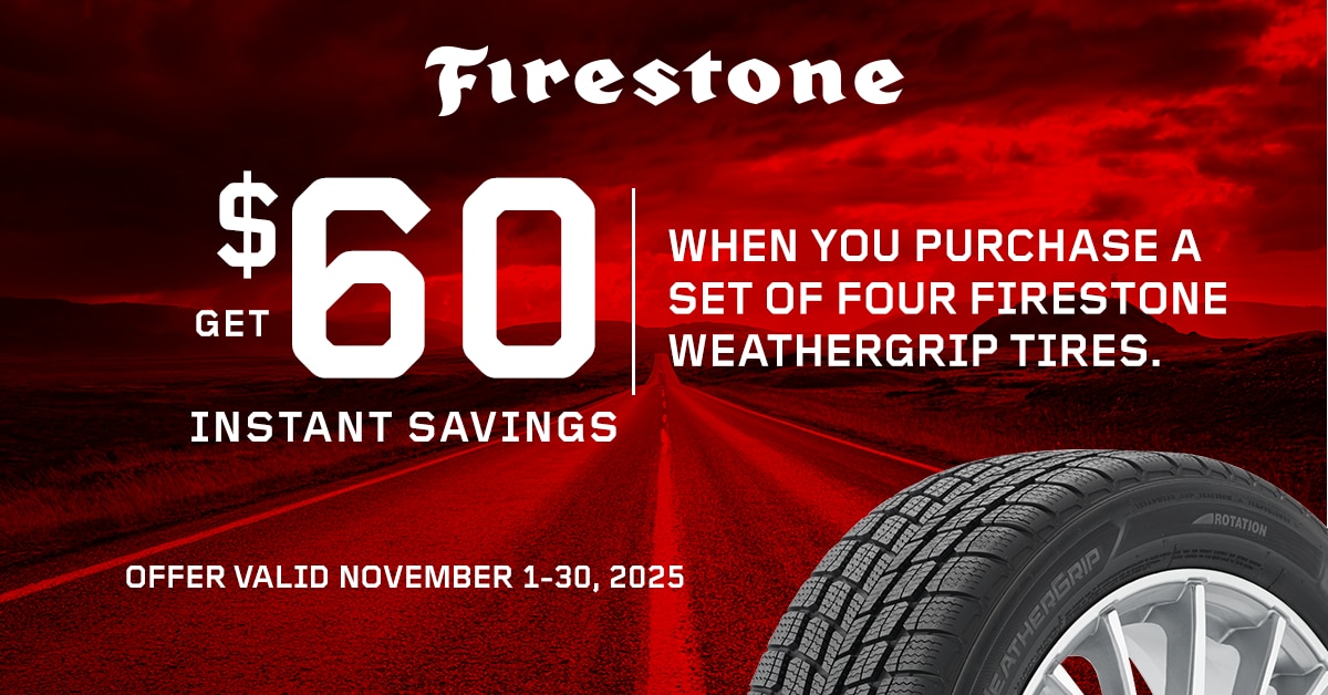 Get $60 Instant Savings when you purchase a set of four Firestone WeatherGrip tires from Tire Rack's in-stock inventory. Offer valid between 12:00 a.m. EDT November 1, 2025 and 11:59 p.m. EST November 30, 2025.