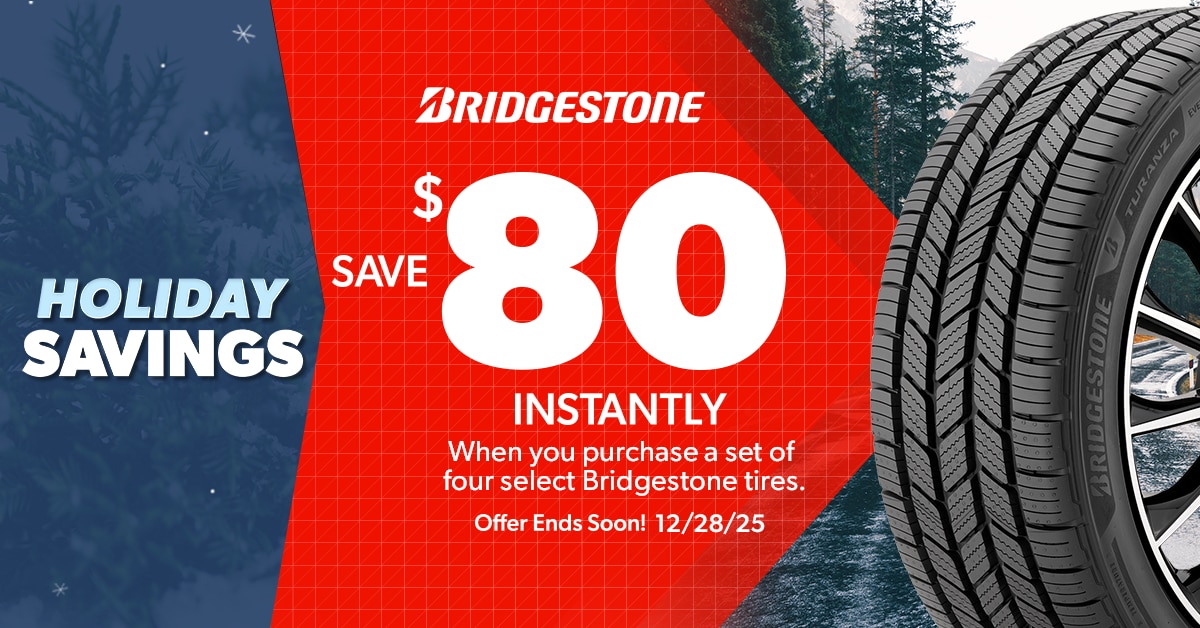 Get $80 Instant Savings ($70 off + $10 additional Tire Rack Savings) when you purchase a set of four select Bridgestone tires from Tire Rack's in-stock inventory. Offer valid until 11:59 p.m. EST December 28, 2025.