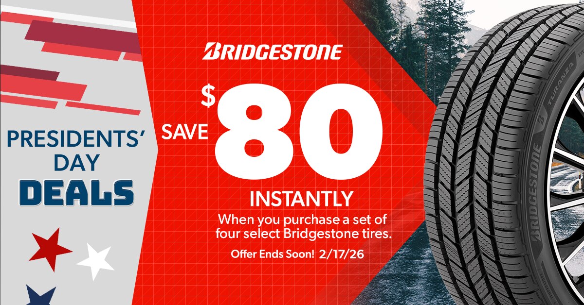 Get $80 Instant Savings [$70 off + $10 additional Tire Rack Savings] when you purchase a set of four select Bridgestone tires from Tire Rack's in-stock inventory. Offer valid until 11:59 p.m. EST February 17, 2026.