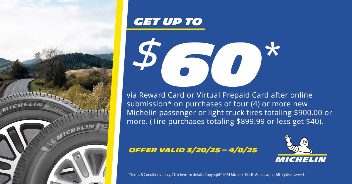 Get $60* via Visa® Reward Card¹ or Visa® Virtual Prepaid Card² after online submission* on purchases of four or more new Michelin passenger or light truck tires totaling $900.00 or more. (Michelin tire purchases totaling $899.99 or less get $40). Offer valid on select tires purchased from Tire Rack's in-stock inventory between 12:00 a.m. EDT March 20, 2025 and 11:59 p.m. EDT April 8, 2025.