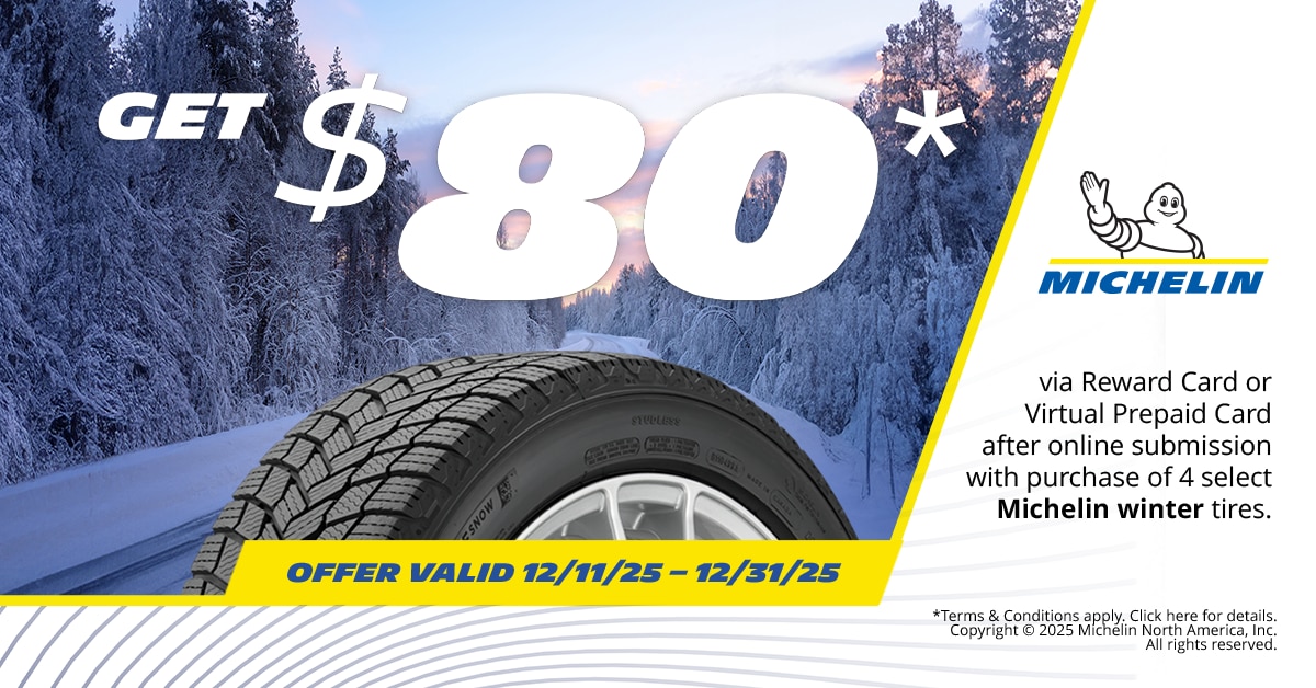 When you purchase a set of four new select Michelin winter passenger or light truck tires you may be eligible to receive $80 via Visa® Reward Card¹ or Visa® Virtual Account² after online submission*. Offer valid on select tires purchased from Tire Rack's in-stock inventory between 12:00 a.m. EST December 11, 2025 and 11:59 p.m. EST December 31, 2025.