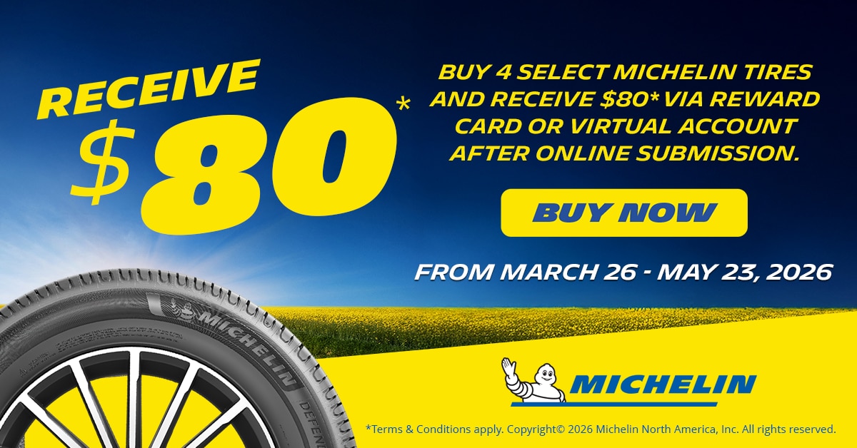 Offer valid for residents of the United States only who purchase from a participating dealer located in the fifty (50) United States, District of Columbia (“U.S.”) and U.S. territories (Puerto Rico, Guam, and U.S. Virgin Islands) (“U.S.”). Purchase must be completed between 3/26/2026 and 5/23/2026. Limit of one redemption request $80 Visa® Reward Card or Visa® Virtual Account per purchase of four new Michelin passenger or light truck tires. Qualifying purchases of four tires cannot include retailer offers in violation of Michelin Promotional Guidelines, including but not limited to: Buy three, get one free or any similar combination (e.g., Buy two, get two free), or the functional equivalent (e.g., Buy three, get the fourth for $1; or get 25% off a set of four tires). Limit of three redemptions per household. Must be at least 18 years of age or older at the time of purchase to be eligible. All requests must be received by 6/23/2026. Please allow four to six weeks for the delivery of the $80 Visa® Reward Card via mail. Please allow three to five weeks for the delivery of the $80 Visa® Virtual Account via email. Sales to Original Equipment manufacturers, fleets, wholesalers, and business accounts, and purchases for resale are not eligible for this promotion. Purchases from warehouse clubs (e.g., Sam's Club, BJ's, Costco), mass merchandisers, and national retailers (e.g., Discount Tire and Big 0) are excluded from this promotion but may be eligible for coverage under a store-specific promotion (see individual store[s] for details). This offer is only valid on purchases from authorized and participating Michelin dealers and is not stackable with any other Michelin manufacturer offer. For example, an eligible purchase can only be submitted to one Michelin manufacturer promotion; subsequent submissions of the same purchase will be disqualified. Cost of mounting, balancing, valve stems, applicable taxes, discounts applied at checkout from a retailer, etc., are not included in determining the purchase amounts under this promotion. In addition, purchases from any nonparticipating dealers are not eligible for this promotion. Tampering with, altering, or falsifying purchase information constitutes fraud. All decisions made by Michelin (or its authorized representatives) relating to the validity of any submissions are final and binding. This promotion is subject to all federal, state, and local laws and regulations. Michelin reserves the right to modify or discontinue this offer, products, and/or services at any time for any reason. No cash refunds. Please retain copies of the materials you submit. All requests become the property of Michelin North America, Inc. and will not be returned. Michelin is not responsible for any lost, late, stolen, damaged, misdirected, incomplete, incorrect, or illegible mail. No postage-due requests. For questions regarding this promotion, please call 1-866-212-9619 Monday through Friday between 8:00 a.m. and 8:00 p.m. ET. Please reference the 2026 Michelin Spring Promotion when calling. Offer may not be assigned, traded, sold, combined, or stacked with any other Michelin manufacturer's offer. THIS OFFER IS NOT VALID WHERE PROHIBITED OR RESTRICTED BY LAW.