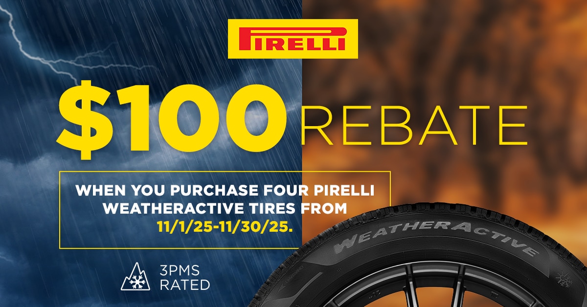 When you purchase a new matching set of four Pirelli WeatherActive tires you may be eligible to receive a $100 Pirelli Mastercard® Prepaid Card via rebate. Offer valid on tires purchased from Tire Rack's in-stock inventory between 12:00 a.m. EDT November 1, 2025 and 11:59 p.m. EST November 30, 2025.