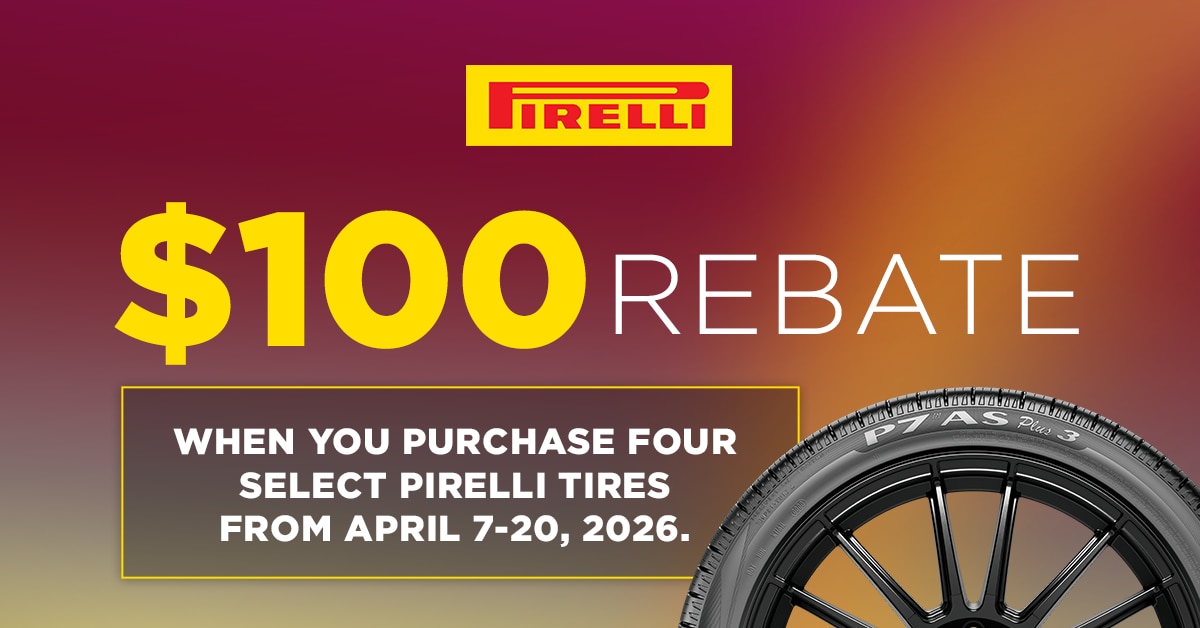 When you purchase a set of four select Pirelli tires you may be eligible to receive a $100 Visa® Prepaid Card by online or mail-in rebate. Offer valid on tires purchased from Tire Rack's in-stock inventory between 12:00 a.m. EDT April 7, 2026 and 11:59 p.m. EDT April 20, 2026.