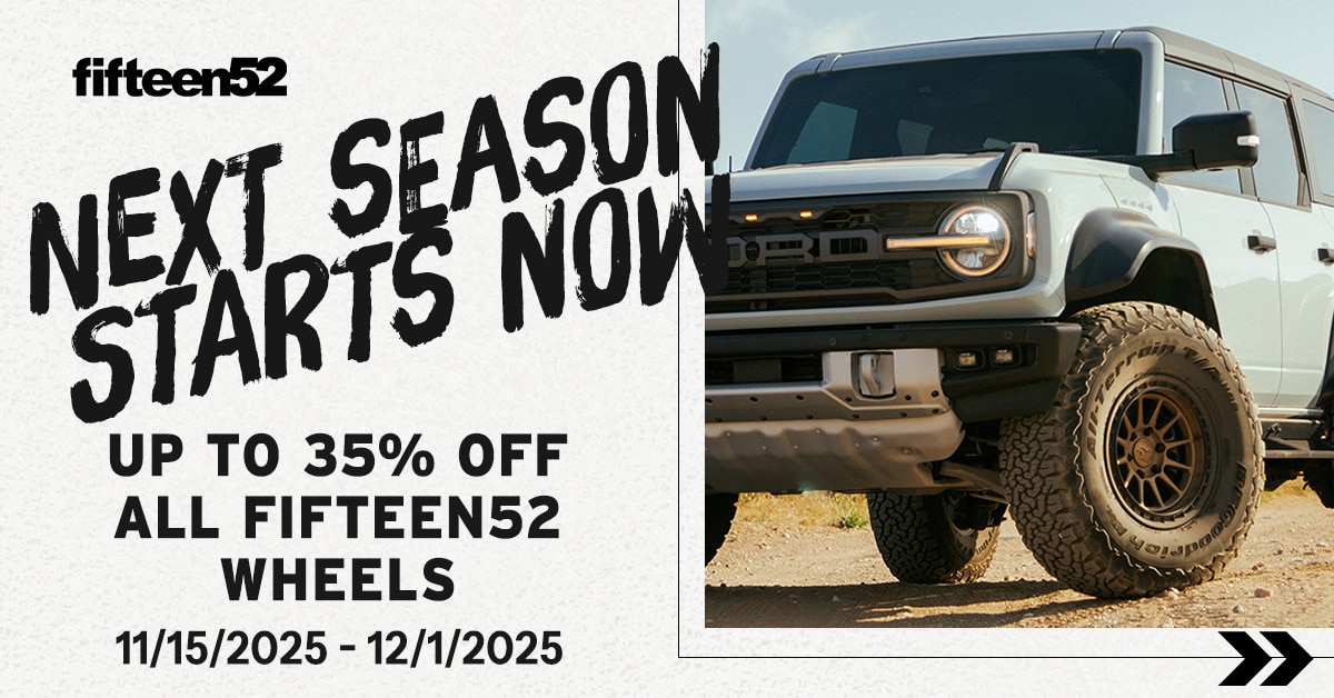 Save up to 35% on all Fifteen52 wheels. Offer valid on Fifteen52 wheels purchased from Tire Rack’s in-stock inventory between 12:00 a.m. EST November 15, 2025 and 11:59 p.m. EST December 1, 2025.