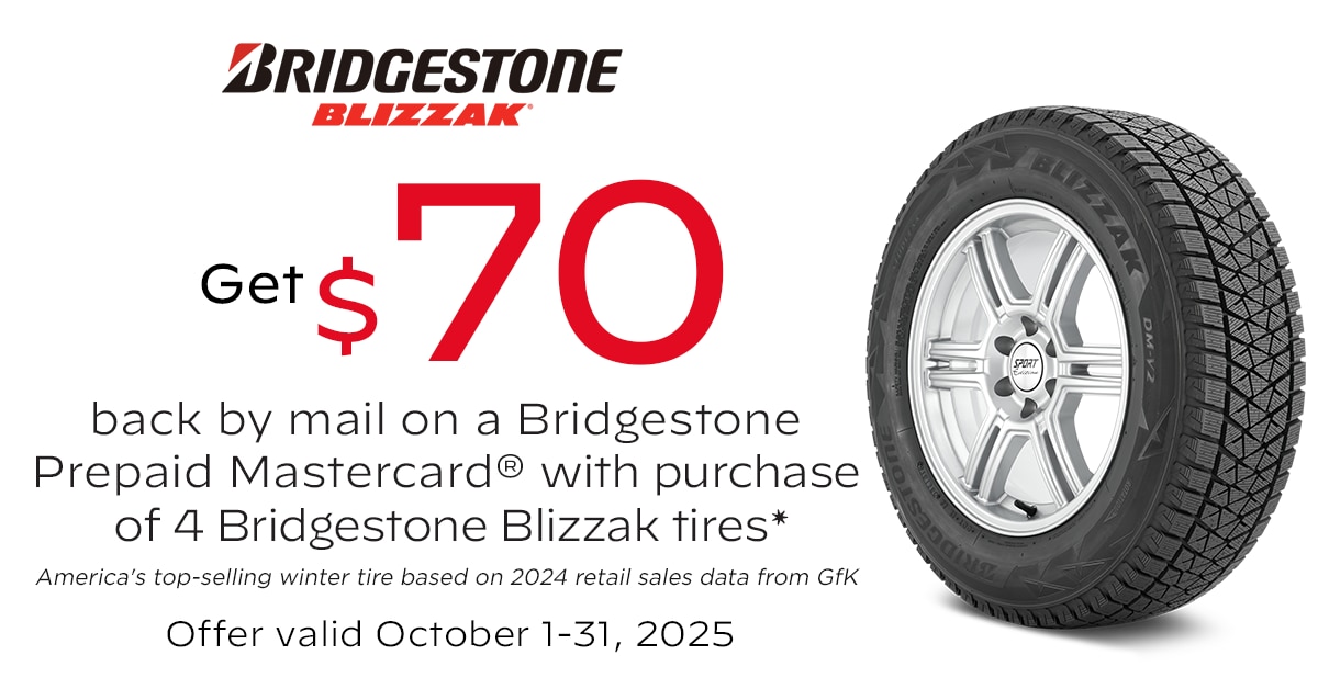 Purchase a set of four select Bridgestone Blizzak tires and you may be eligible to receive a $70 Bridgestone Prepaid Mastercard® by online rebate. Offer valid on tires purchased from Tire Rack’s in-stock inventory between 12:00 a.m. EDT October 1, 2025 and 11:59 p.m. EDT October 31, 2025.