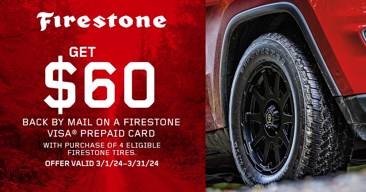 Purchase a set of four select Firestone tires and you may be eligible to receive a $60 Visa® Prepaid Card via online rebate. Offer valid on tires purchased from Tire Rack's in-stock inventory between 12:00 a.m. EST March 1, 2024 and 11:59 p.m. EST March 31, 2024.