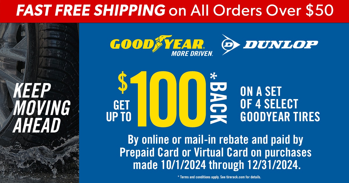 When you purchase a set of four select Goodyear or Dunlop tires you may be eligible to receive up to a $100 Goodyear Visa® Prepaid Card or Virtual Account by online or mail-in rebate. Offer valid on tires purchased from Tire Rack's in-stock inventory between 12:00 a.m. EDT October 1, 2024 and 11:59 p.m. EST December 31, 2024.